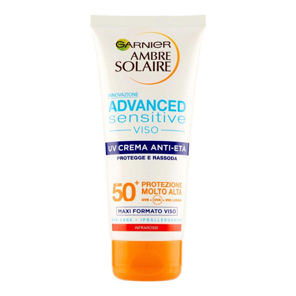 Garnier Ambre Solaire Advanced Sensitive Protezione Solare Viso Anti Eta' SPF 50+: Per pelli chiare e sensibili al sole.