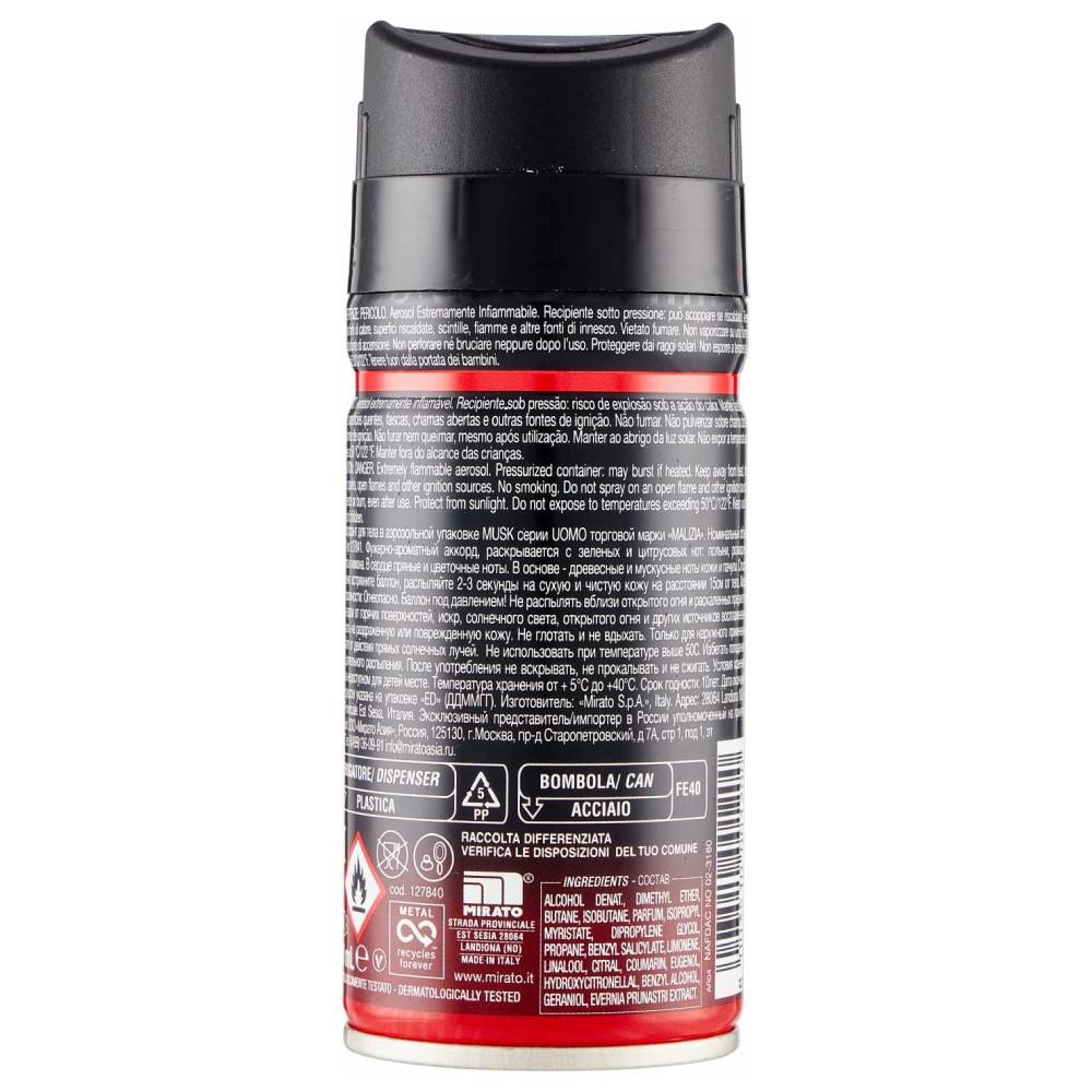 Agitare bene prima dell'uso. Spruzzare il deodorante Malizia Uomo Musk da una distanza di circa 15 cm sulla pelle pulita e asciutta delle ascelle. Può essere utilizzato anche su altre parti del corpo per un effetto di profumazione più intenso.