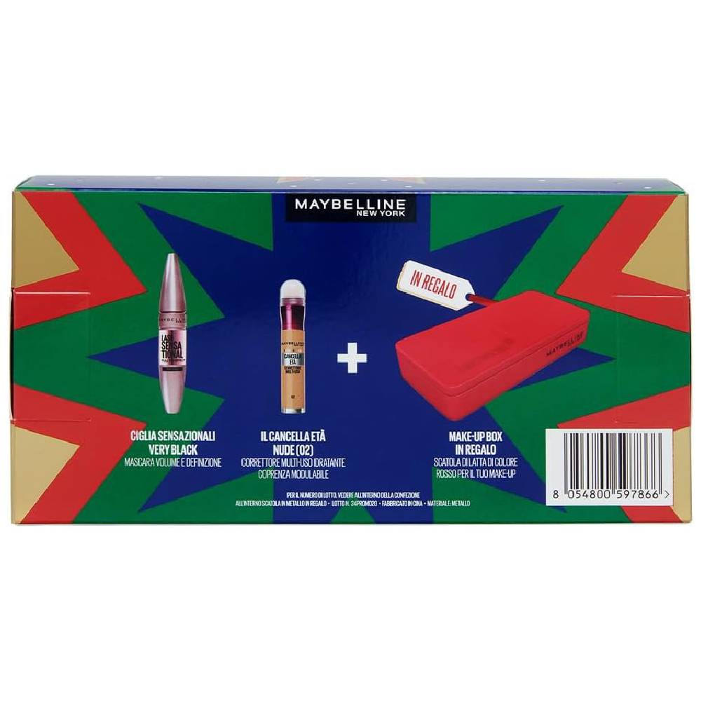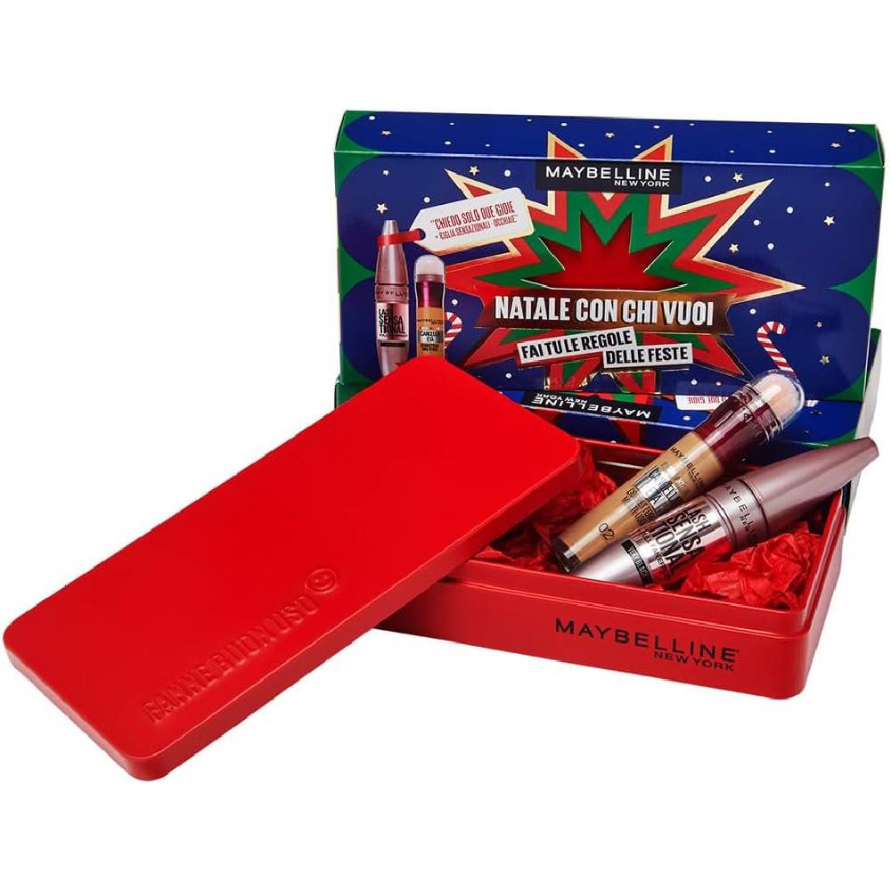 Questo Fantastico Cofanetto Regalo contiene: 1 Mascara Volumizzante Lash Sensational Tonalità Intense Black 9,5ml e 1 Correttore Cancella Età Tonalitá 02 Nude con la speciale MakeUp Box in latta colorata di rosso, per riporre i tuoi accessori MakeUp.