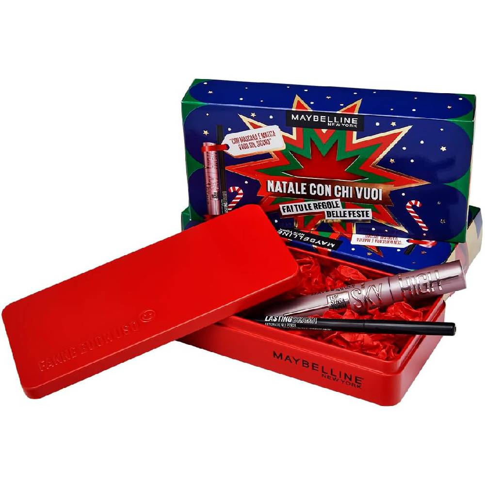 Questo Fantastico Cofanetto Regalo contiene: 1 Mascara Volumizzante Sky High Tonalità Black 7,2ml e 1 Matita Occhi Ultra Pigmentata Lasting Drama Tonalità Black 1g con la speciale MakeUp Box in latta colorata di rosso, per riporre i tuoi accessori MakeUp.