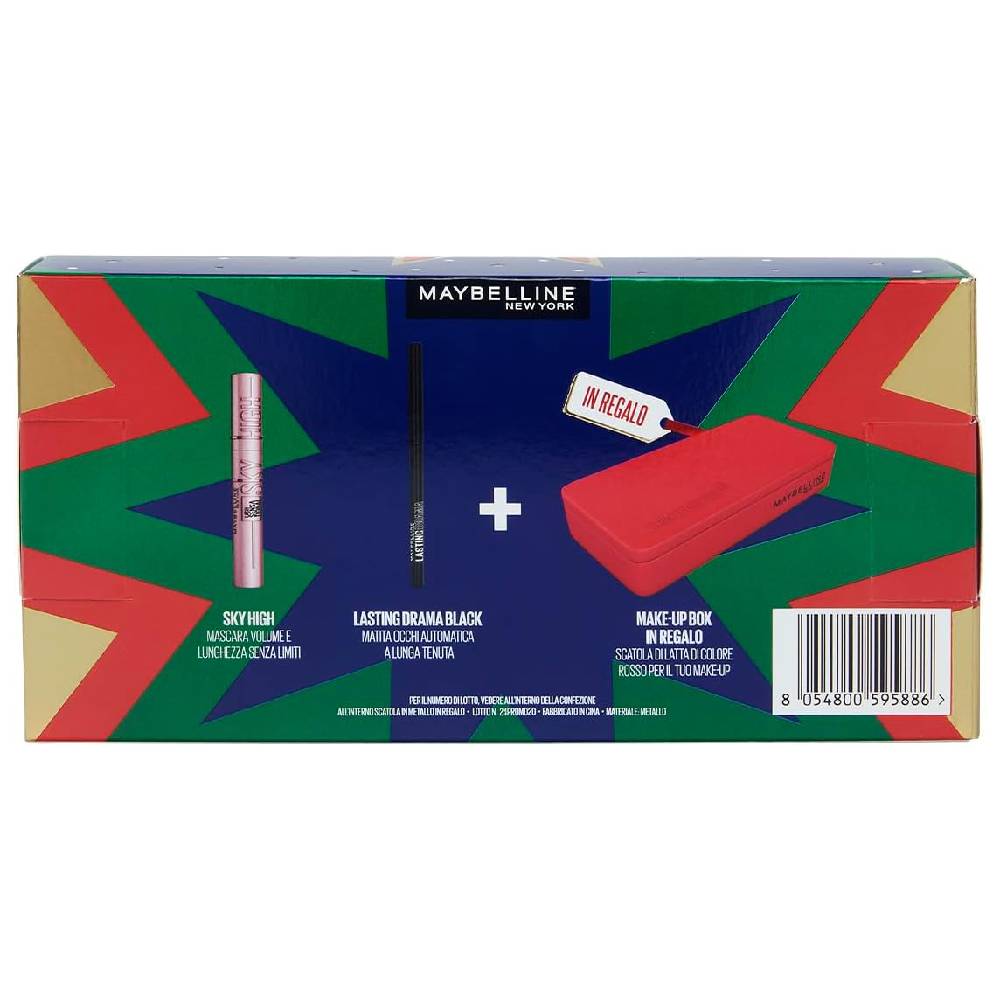 Questo Fantastico Cofanetto Regalo contiene: 1 Mascara Volumizzante Sky High Tonalità Black 7,2ml e 1 Matita Occhi Ultra Pigmentata Lasting Drama Tonalità Black 1g con la speciale MakeUp Box in latta colorata di rosso, per riporre i tuoi accessori MakeUp.