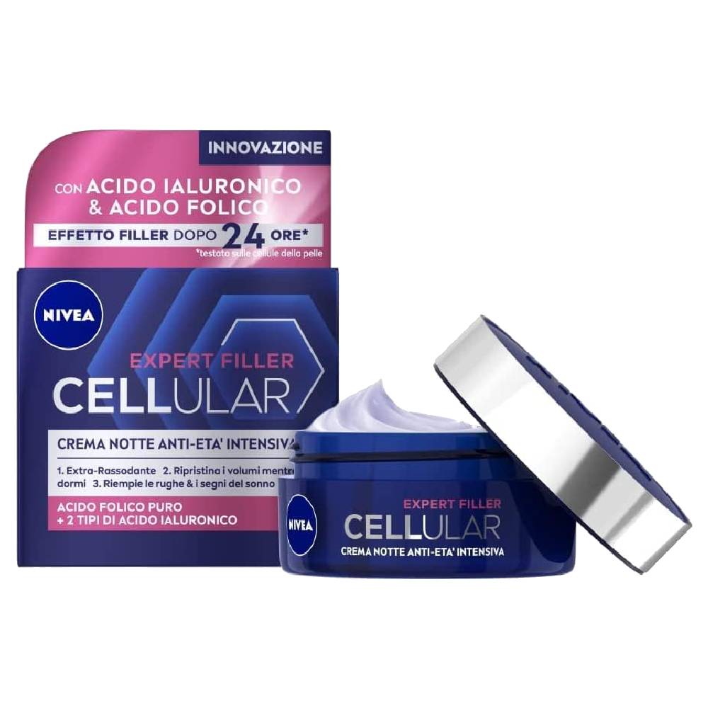 Nivea Cellular Expert Filler è una Crema Notte Anti-Età Intensiva la cui innovativa formula agisce a livello cellulare, garantendo un effetto filler dopo sole 24h, rassodando il viso per un aspetto più giovane e sano.
