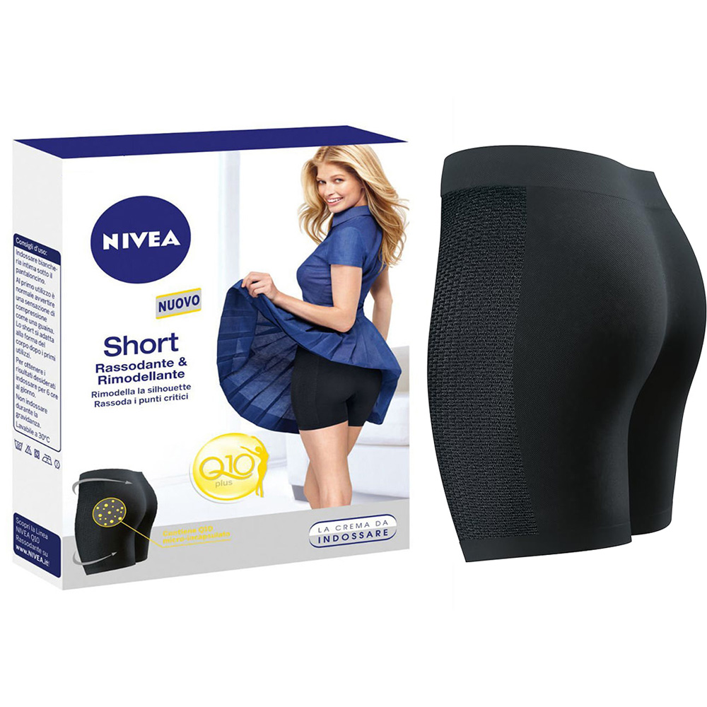 I ricercatori Nivea hanno sviluppato insieme agli esperti del tessile Tanatex un comodo short che, non solo rimodella la figura ma, grazie alle micro capsule di Q10, Olio di Mandorla Aloe Vera nel tessuto, rassoda efficacemente la pelle.