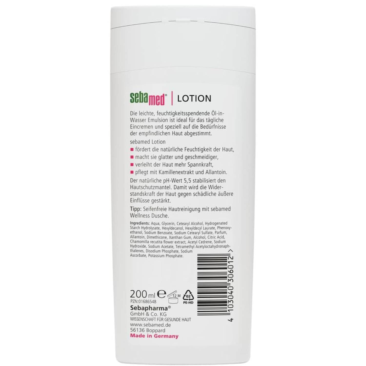 Emulsione olio in acqua leggera e idratante, ideale per uso quotidiano ed appositamente studiata per le esigenze della pelle sensibile. Con il pH fisiologico di 5.5 rafforza e protegge il mantello acido della pelle. Grazie alla formula con estratto di Camomilla e Allantoina lenisce la pelle, conferendole morbidezza ed elasticità con un effetto calmante e rinfrescante naturale. Si assorbe rapidamente e con facilità, senza lasciare residui grassi. Formula senza additivi coloranti.